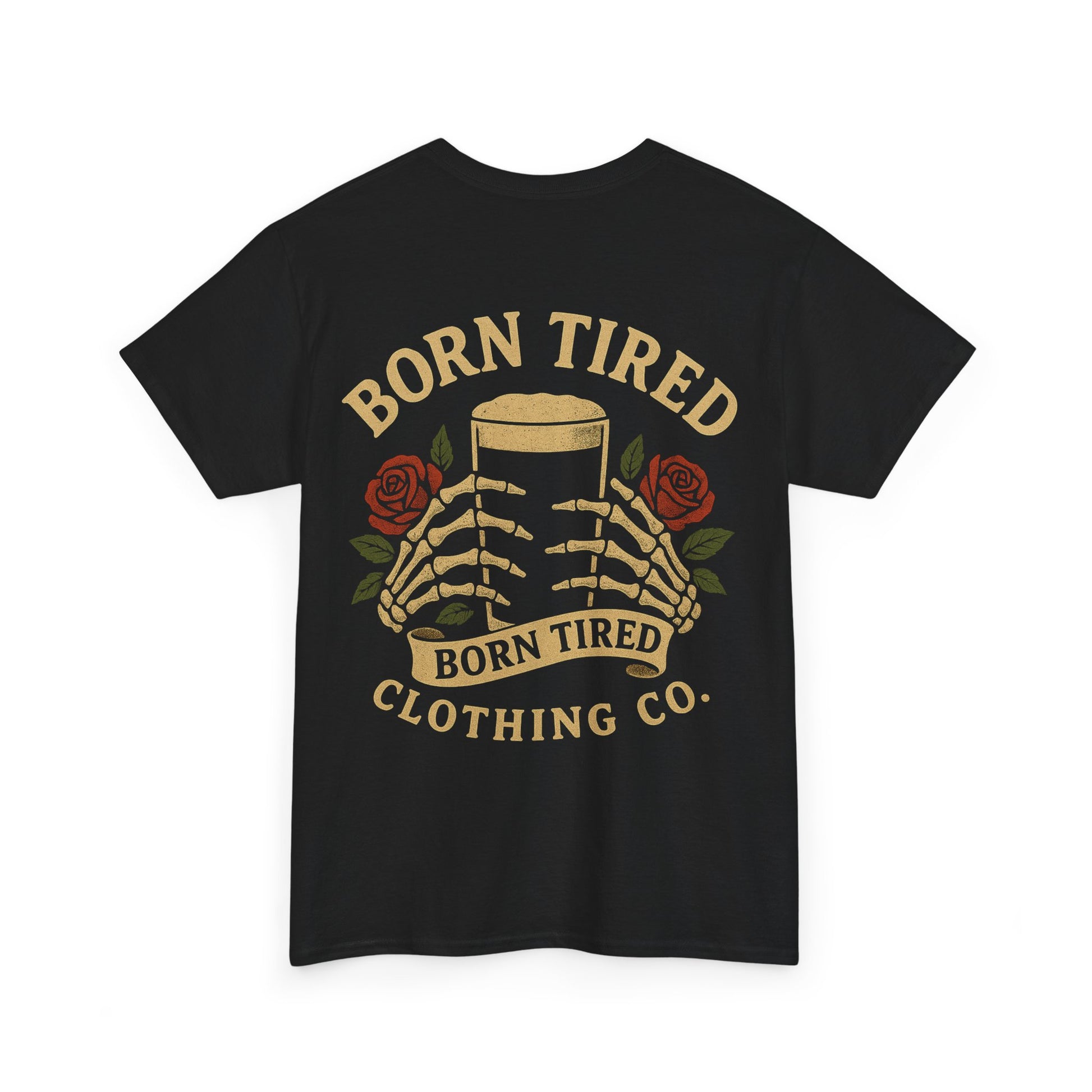 Crafted from premium cotton for everyday comfort, it features a small chest print up front and a full custom graphic on the back — a pint surrounded by roses, finished with our signature Born Tired aesthetic.