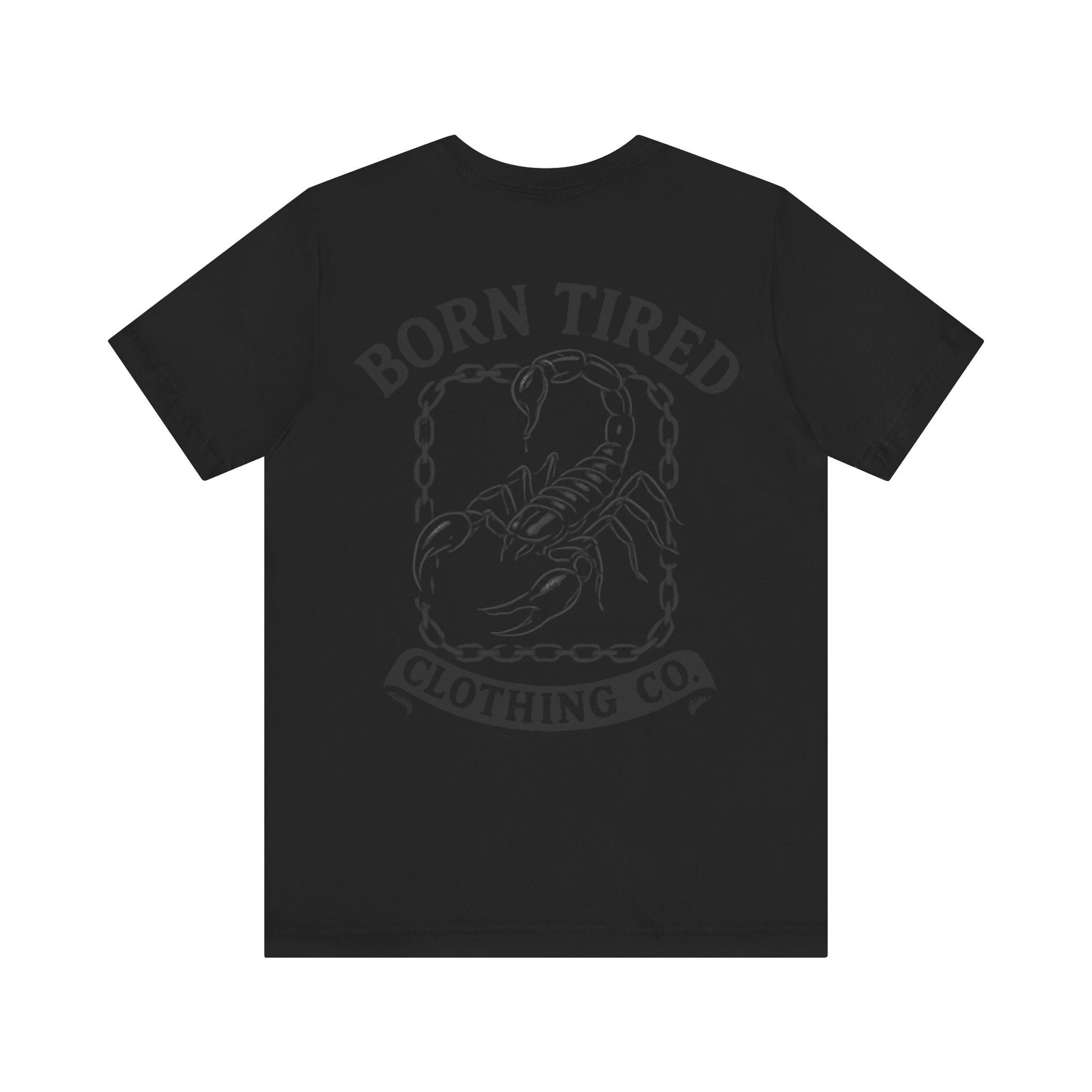 Back graphic: the chain-bound scorpion — still standing, still swinging.